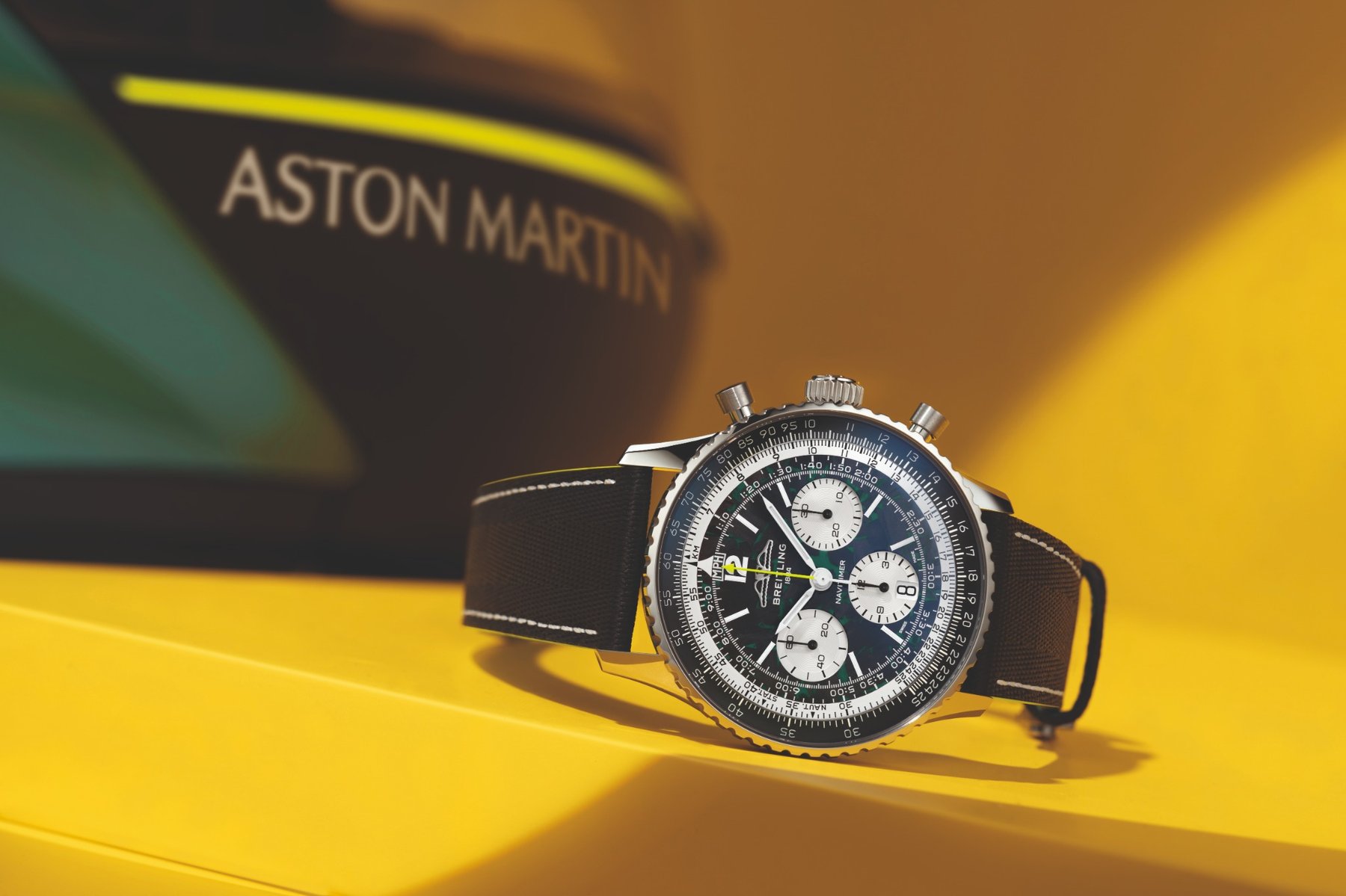 O mostrador em fibra de carbono parece capturar a essência do cockpit do AMR26, enquanto os detalhes em Aston Martin Racing Green surgem como assinatura cromática de um universo onde estética e performance nunca se separam. Pela primeira vez, um Navitimer recebe uma caixa em titânio, material ultraleve e resistente, escolhido não por moda, mas por necessidade — a mesma lógica que rege o automobilismo de elite, onde cada grama importa e cada decisão conta.