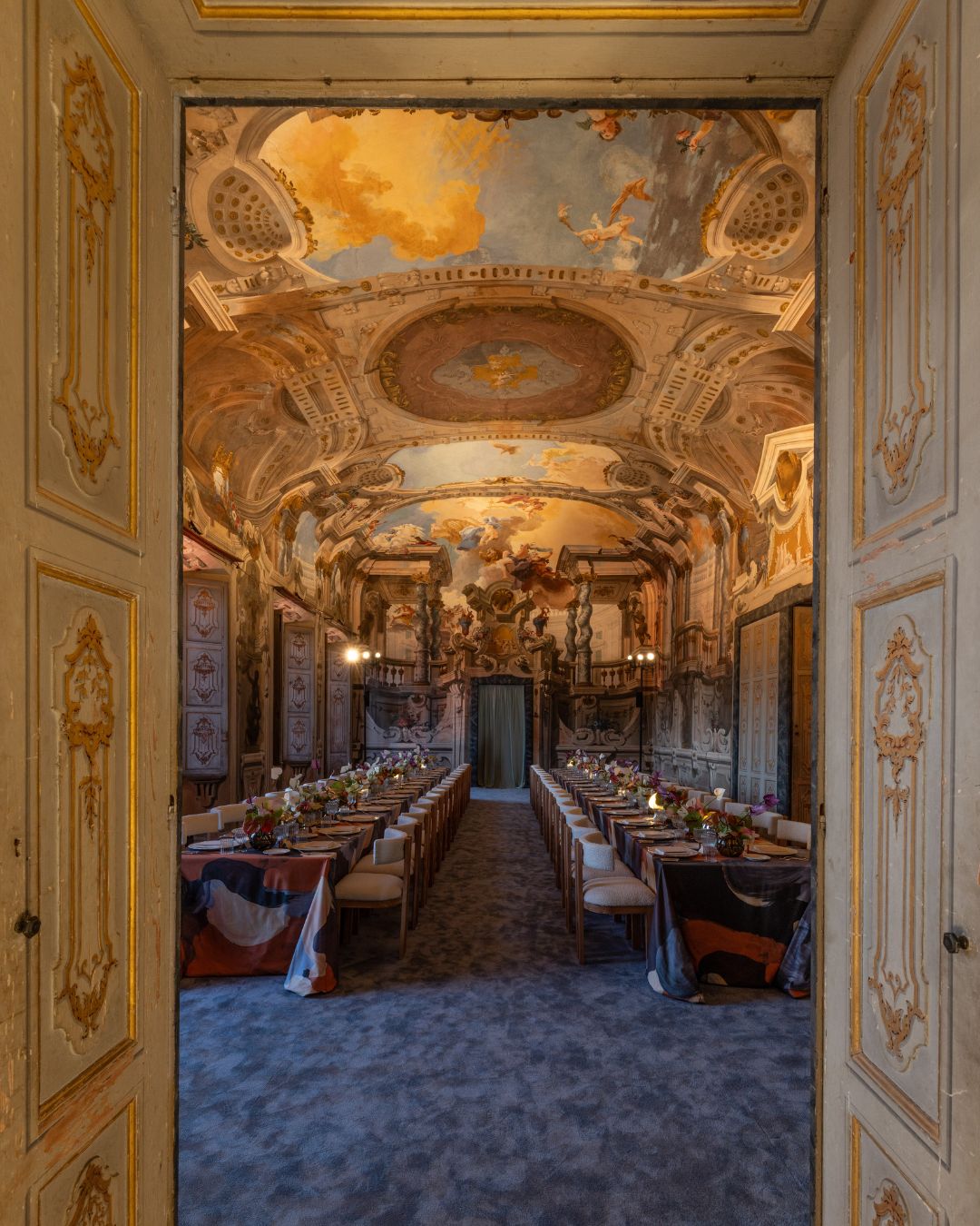 A noite de apresentação seguiu essa mesma lógica de encantamento e precisão. Recebidos por uma fachada iluminada que parecia anunciar um espetáculo silencioso, os convidados atravessaram salões onde a coleção dialogava com afrescos, espelhos, volumes e projeções imersivas. Em cada ambiente, uma linguagem artística ganhava protagonismo: a pintura se manifestava nas combinações cromáticas, a escultura na materialidade e no movimento, e a arquitetura na construção rigorosa da luz e da perspectiva. O resultado foi uma mise-en-scène rara, daquelas em que tudo parece cuidadosamente pensado para provocar não apenas admiração, mas memória.