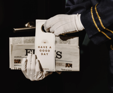Hoteleiro segurando placa “have a good day”